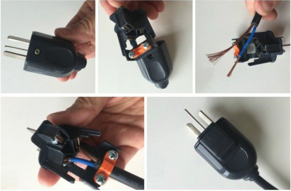 Abrimos la ficha (enchufe) tal como lo ves en la imagen. Tomas el cable, los separas y pelas ambos extremos. Cada cable debes colocarlo en los bornes correspondientes, asegurándonos que todos los hilos entren y queden bien firmes, ajustas cada uno y cerras el enchufe.