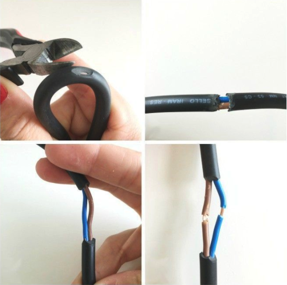 Paso 3. Comenzamos a pelar la goma que recubre los cables interiores (generalmente azul y marrón) y con ayuda de la herramienta adecuada, los separas y dejas pelados para luego unir el cable del porta lámparas.