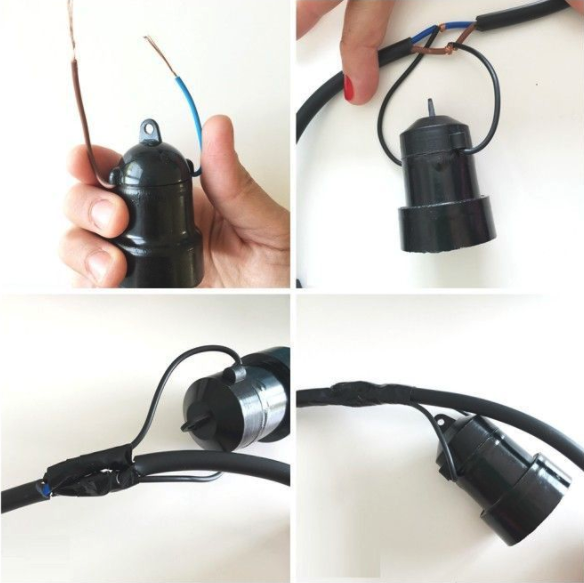 Tomas el portalámpara y pelas ambos extremos de sus cables. Enroscas uno de los cable del portalámpara en el cable azul y el otro cable del portalámparas, en el marrón. Cubrís íntegramente cada cable por separado con la cinta aisladora, asegurándote que queden bien unido y firme. Por último, cubrís todo junto para que te queden bien sujetos cable y portalámparas.